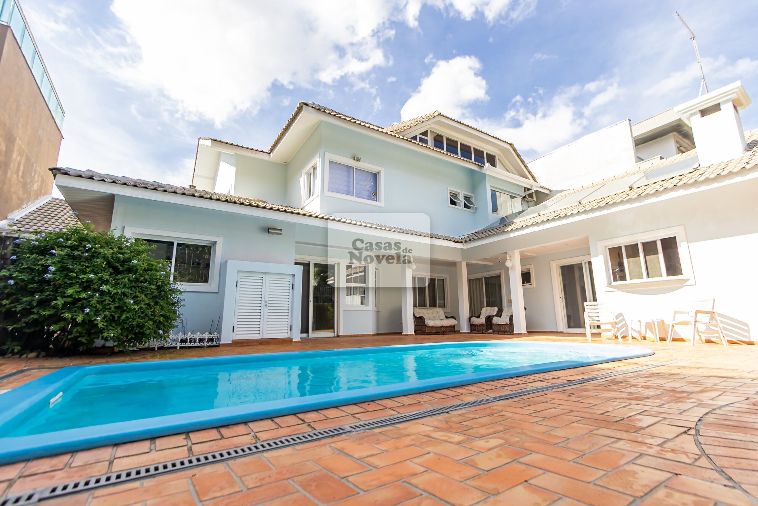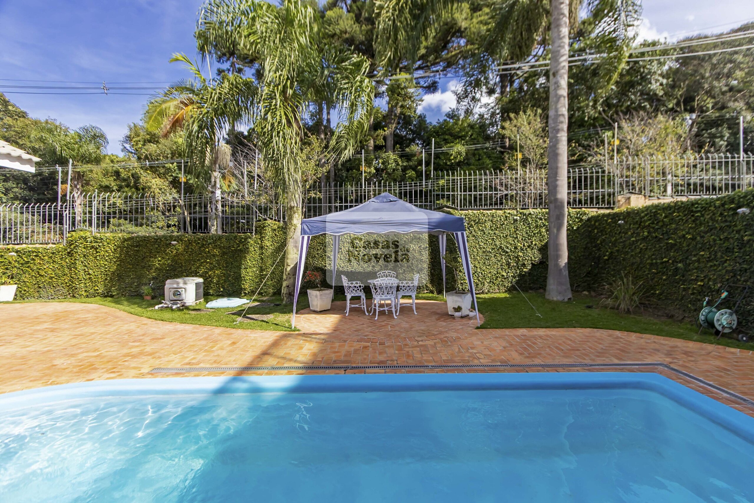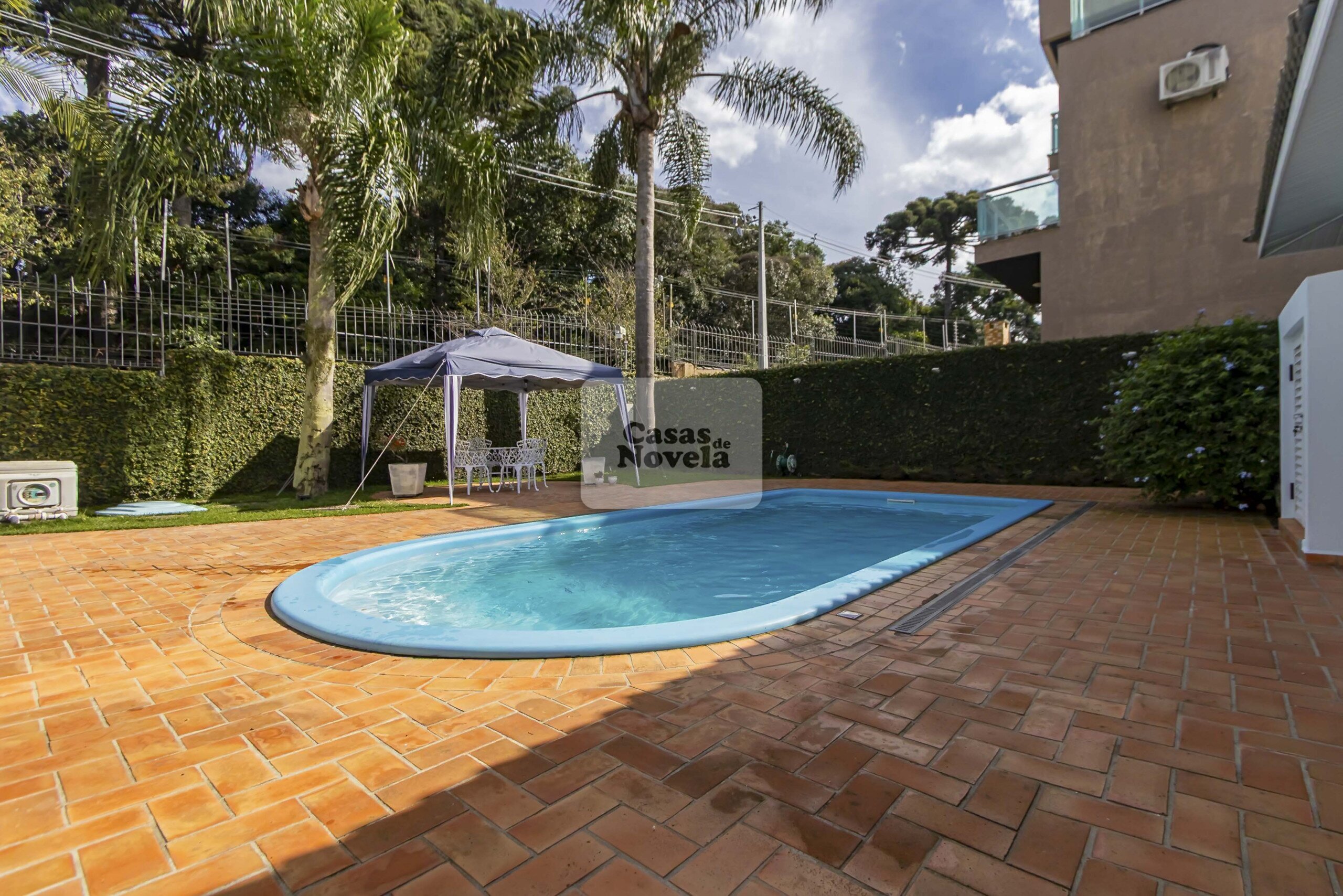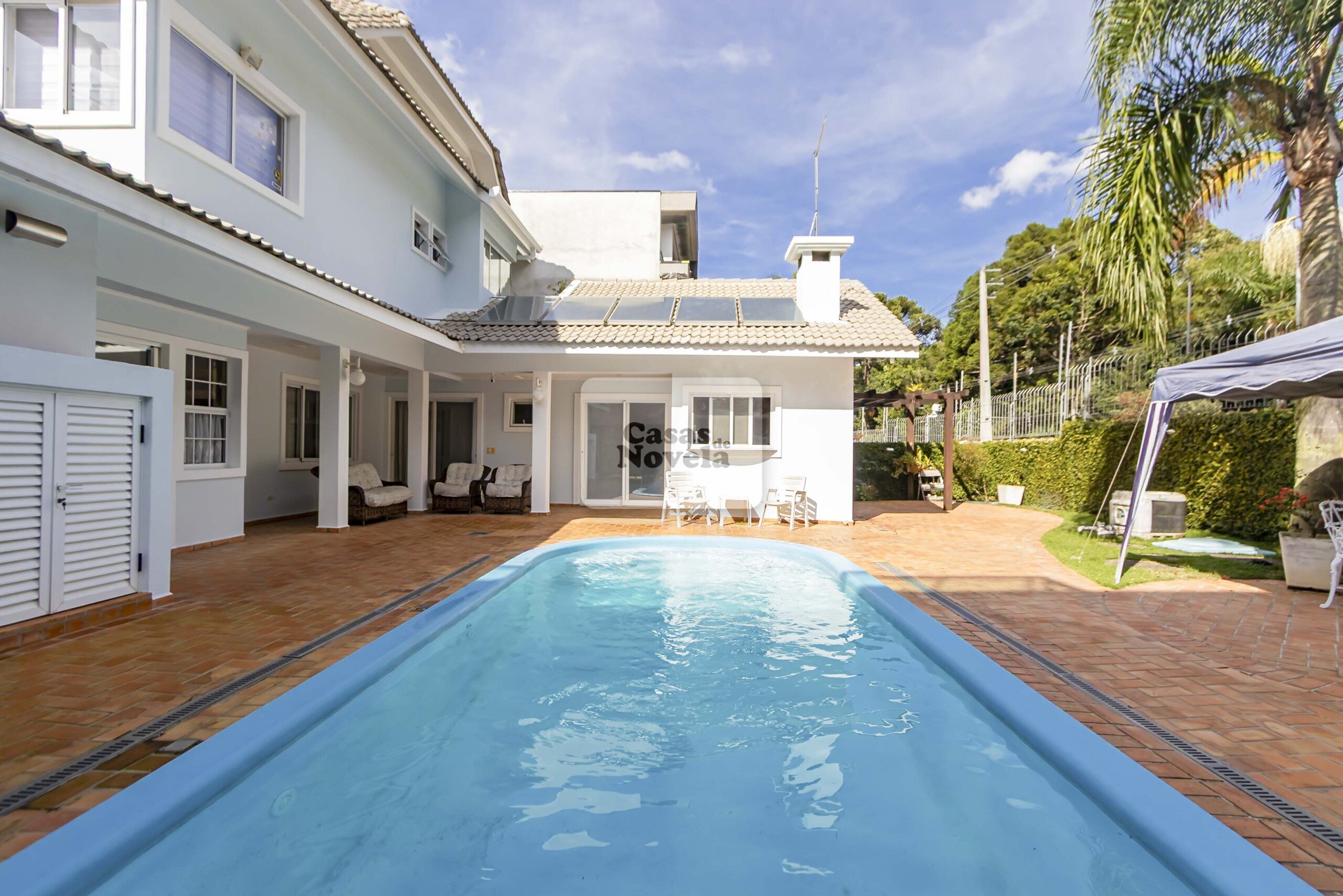 Nos fundos, uma grande piscina aquecida;