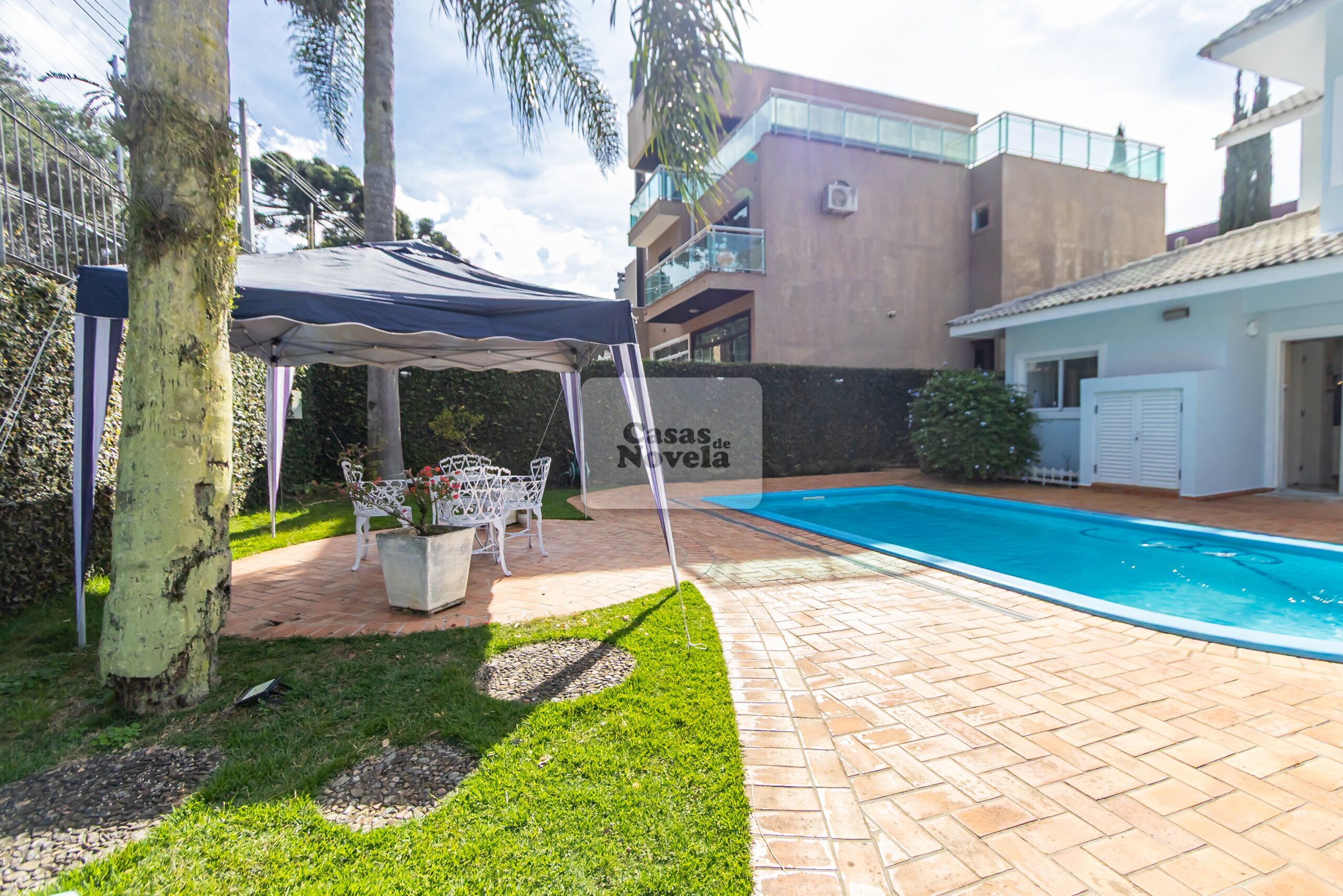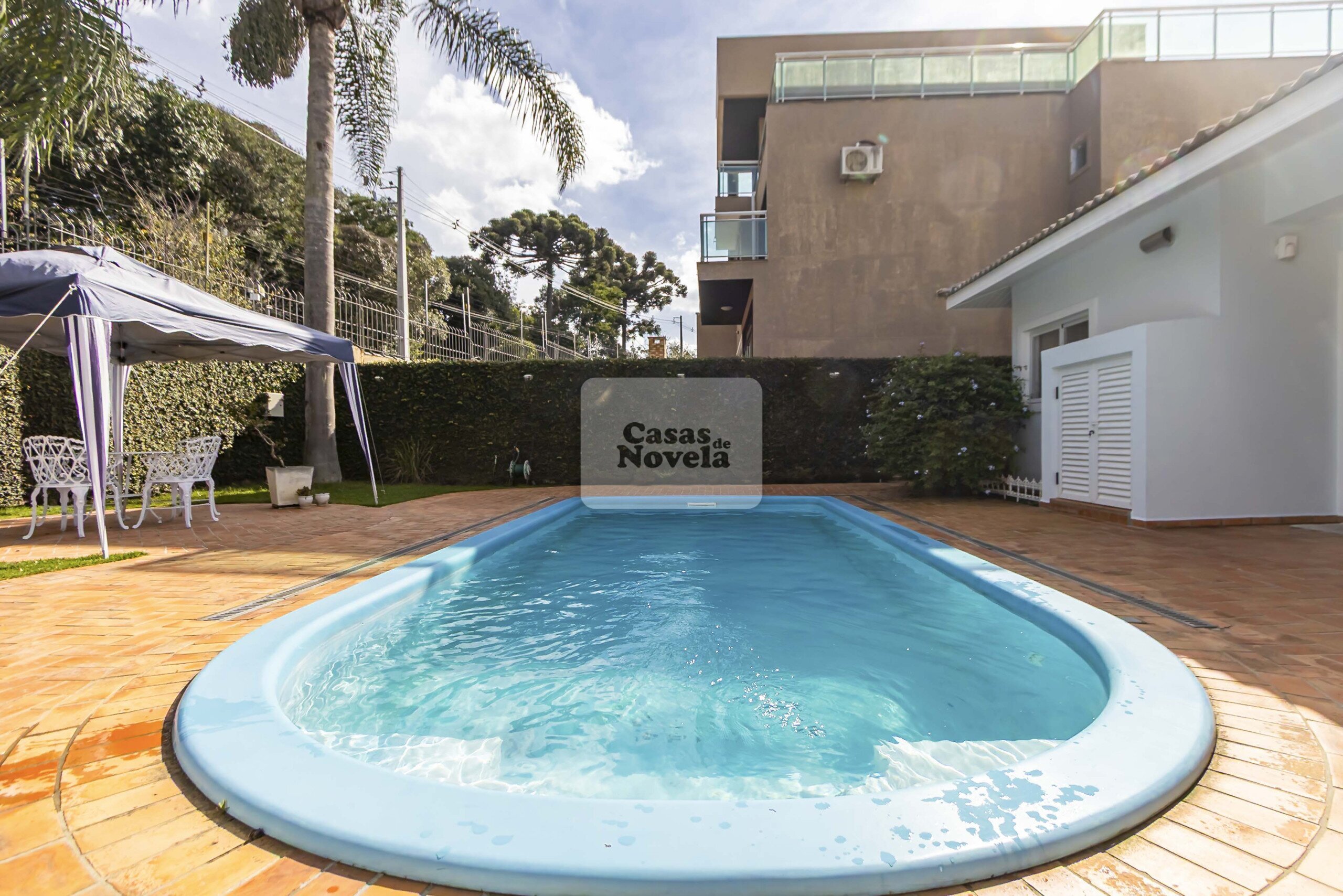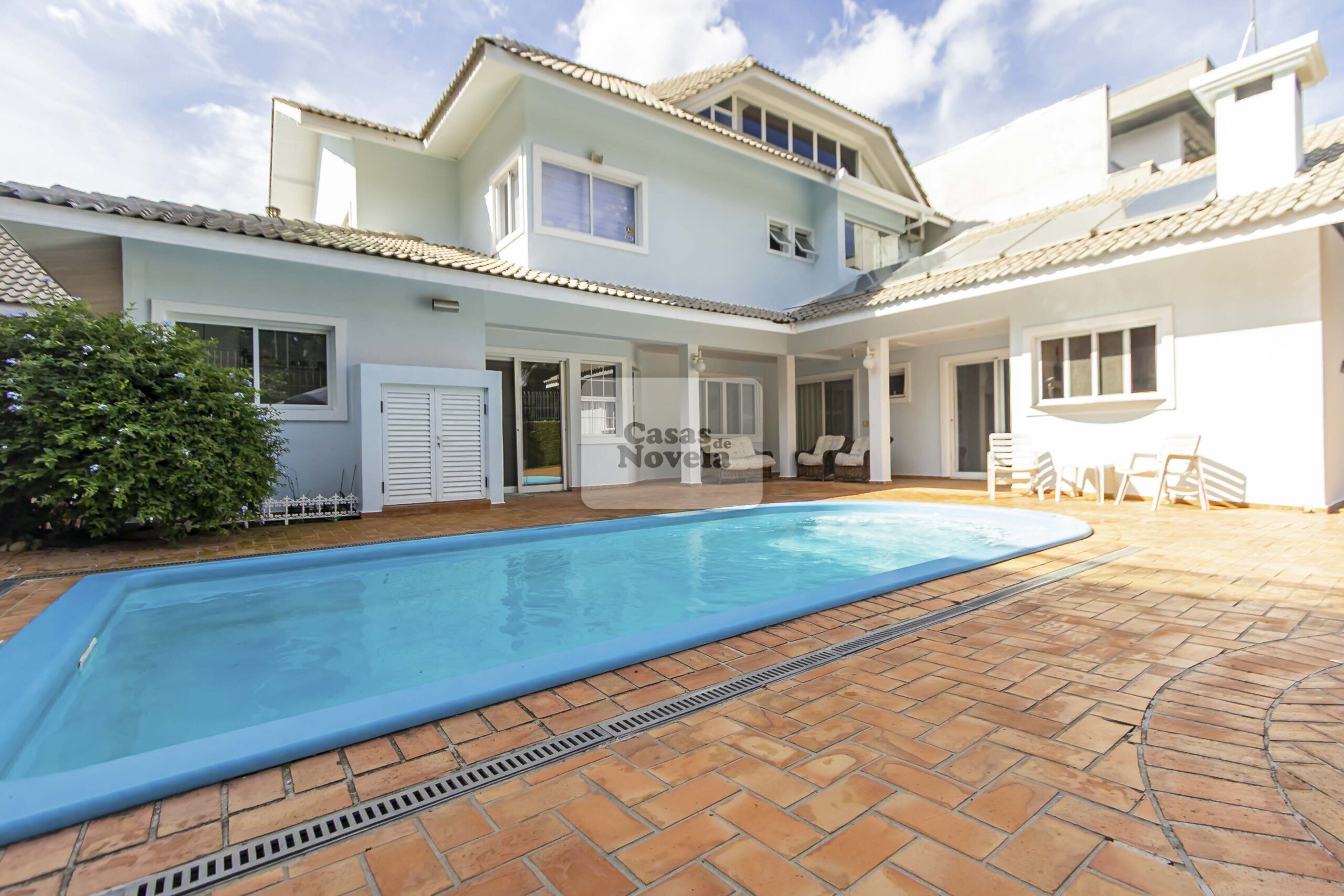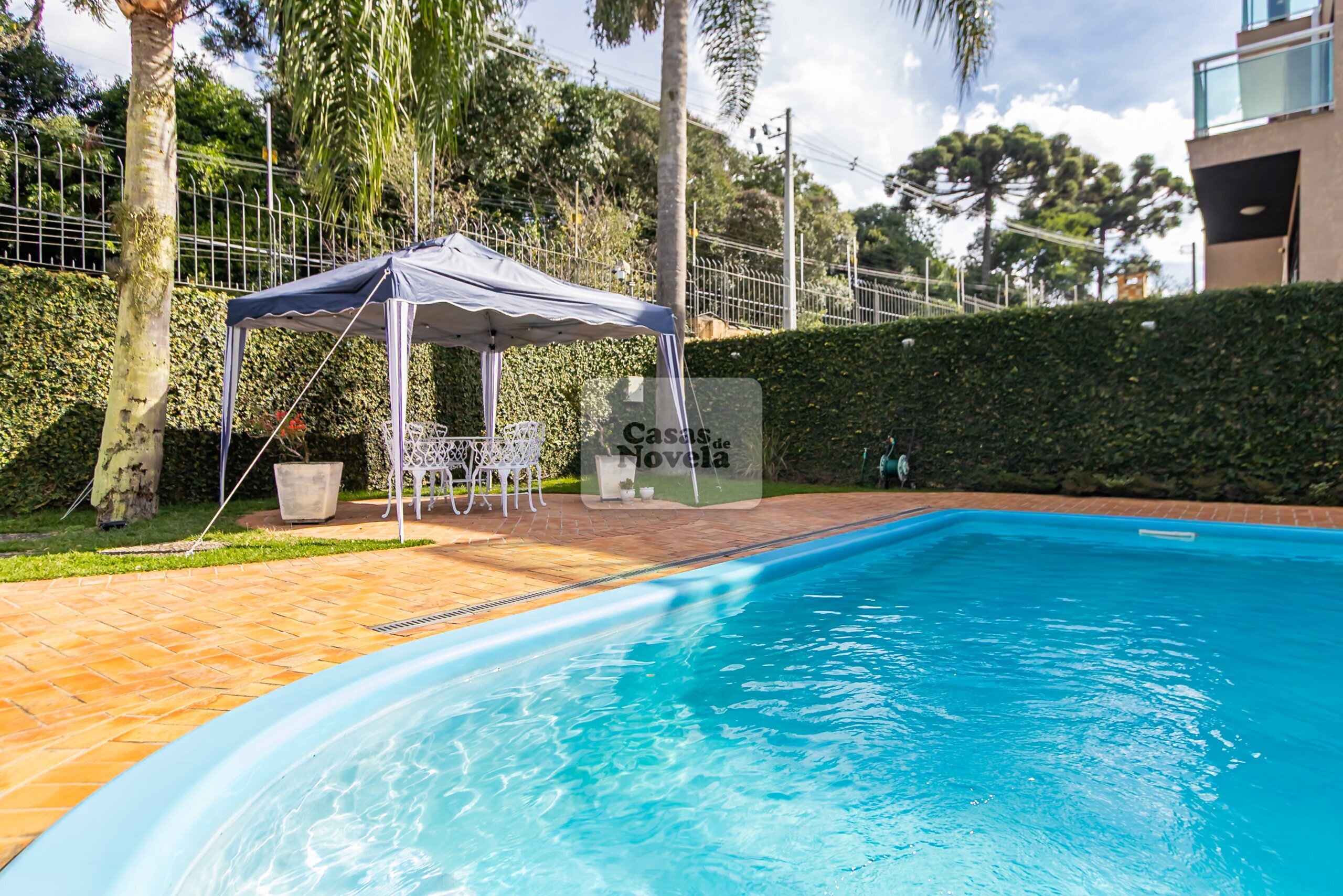 Nos fundos, uma grande piscina aquecida;