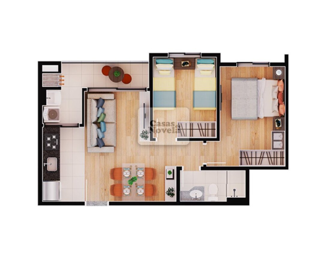 Conta com sala e cozinha integradas, dois dormitórios , um banheiro e uma vaga de garagem.